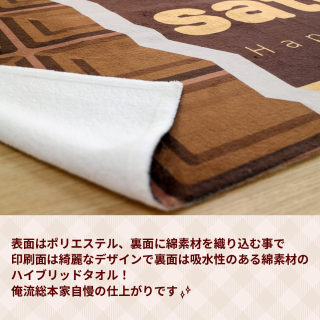 また、板チョコ風バスタオルは、俺流総本家がメーカーと共同開発した新素材のハイブリッドタオルです。印刷面は、名入れやデザインが映えるポリエステル。昇華印刷の美しさを実感していただけます。裏面は、吸水性抜群&優しい感触の綿素材です。