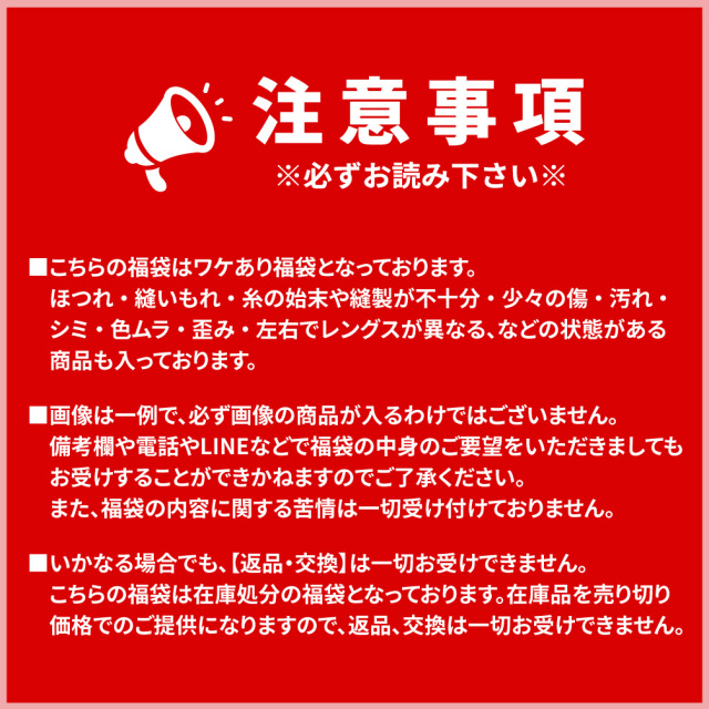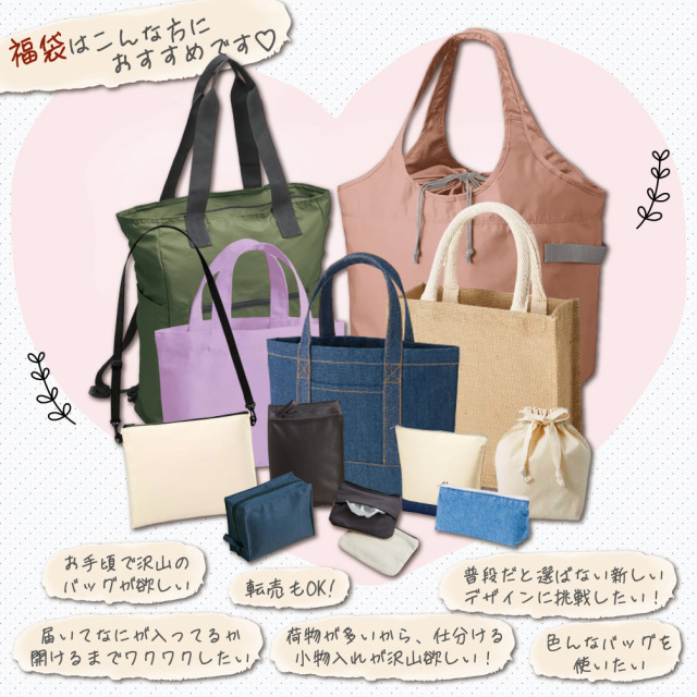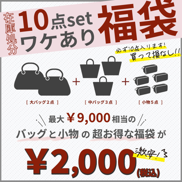 TOP イベント1月 【在庫限り】バッグ ワケアリ 福袋 10点セット サコッシュ ポーチ 価格: ¥2,000 (税込) [ポイント還元 20ポイント~] 販売期間: 商品について: 訳アリ福袋のため、ほつれ・縫いもれ・糸の始末や縫製が不十分・少々の傷・汚れ・シミ・色ムラ・歪み・左右でレングスが異なる商品も入っております。 選択してください 了承しました。 返品交換不可: 画像は一例となっております。 商品に関する苦情や返品・交換は一切お受けできません。 選択してください 了承しました。 ラッピングは対応しておりません。: 選択してください 了承しました。 数量: 個 在庫 ○ 返品についての詳細はこちら 商品のお届けに関し こちらの商品は送料別で宅配便となっております。 通常宅配で発送の為「お届けご希望日時」ご指定頂けます。ただ、こちらの商品は発送まで3~5日掛かりますので、3営業日以降の日付設定でお願い致します。 Tel:0479-74-8261(受付:9:00-17:30※土日祝は定休) 配送について 宅配便発送にて、ご購入者様と受取人様が異なる場合は、送り状品名にご購入者様のお名前を記載させていただきます。 直送される方はなるべく事前に受取人様へご連絡をお願いいたします。 お問合せはこちら